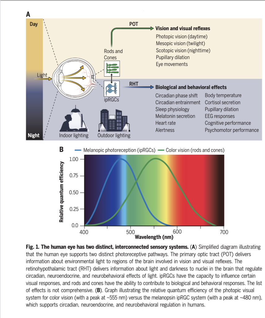 El problema es que este sistema es extremadamente sensible. Estudios clásicos han demostrado que niveles de luz comparables a los de una sala de estar por la noche —alrededor de 100 lux— pueden provocar retrasos significativos del reloj circadiano (Journal of Physiology). La luz azul, presente en muchos LEDs y pantallas, es particularmente disruptiva: puede suprimir una parte sustancial de la melatonina incluso con exposiciones breves en la tarde o noche (PNAS; Chronobiology International).
